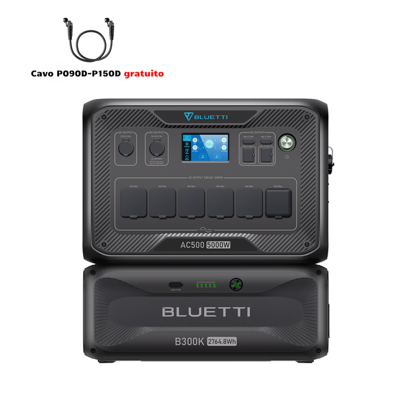 Anche in questo caso l'offerta vede uno sconto molto importante, che supera il 20%. Grazie a questa promozione la coppia BLUETTI AC500+B300K scende sotto i duemila euro e ferma il suo prezzo di acquisto a 1.999 €. Non solo, nel bundle è incluso anche il cavo P090D a P150D che permette di collegare la batteria e la power station sfruttando il massimo della potenza a disposizione.