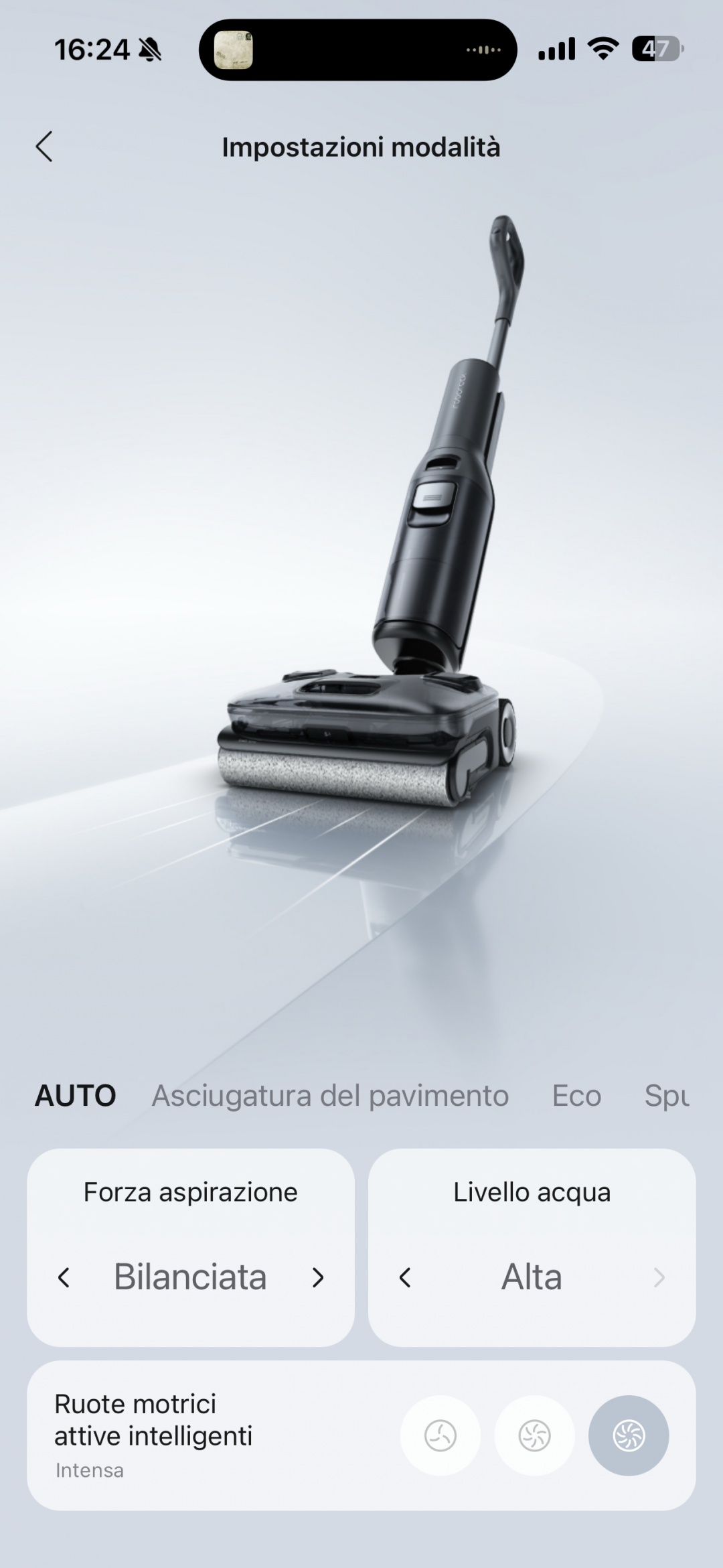 Non manca la possibilità di selezionare parametri di funzionamento specifici per le differenti modalità operative del robot, scegliendo per quella AUTO tanto la potenza di aspirazione predefinita come il livello dell'acqua utilizzato per pulire il pavimento. Anche per le ruote motrici è possibile scegliere tre differenti configurazioni, con un'azione che può essere maggiormente incisiva a seconda delle preferenze dell'utente.